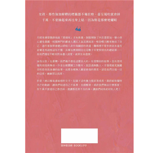 ◆ 她是臺灣版的金智英,更是青春版的陳嘉玲,用善感嫻熟的筆、洞悉敏銳的眼,寫給這世代每一個身為女孩,或曾為女孩的妳