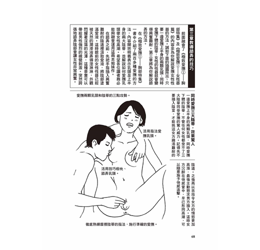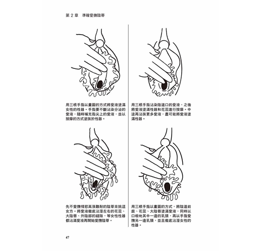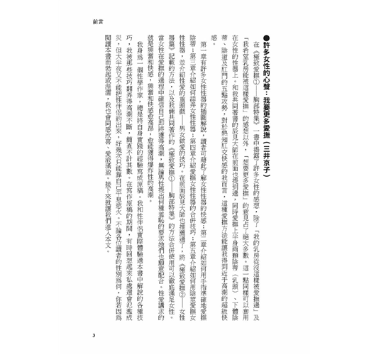 ●許多女性的心聲:我要更多愛撫(三井京子)在《極致愛撫1——胸部特集》一書中揭露了許多女性的感想,除了「我的乳房從沒這樣被愛撫過」及「我希望乳房能被這樣愛撫」的感想以外,「想要更多愛撫」的意見占了絕大多數。這一點同樣可以套用在女性的性器上。和我共同著書的辰見大師在前面也提到過,同時愛撫上半身兩顆陰蒂(乳頭)、下體陰蒂、陰道及肛門的五點攻勢,對於熟知肛交快感的我而言,這種愛撫方法能讓我得到近乎高潮的超級快感。