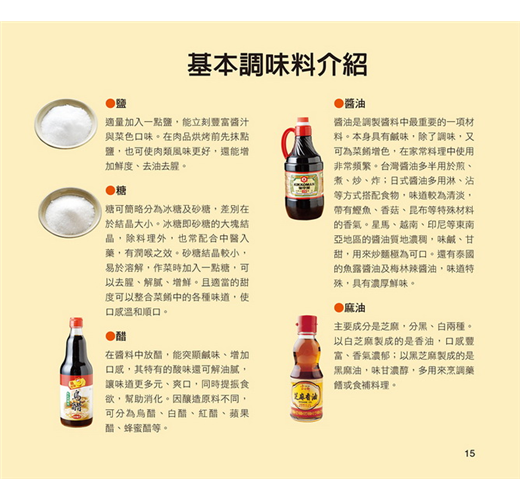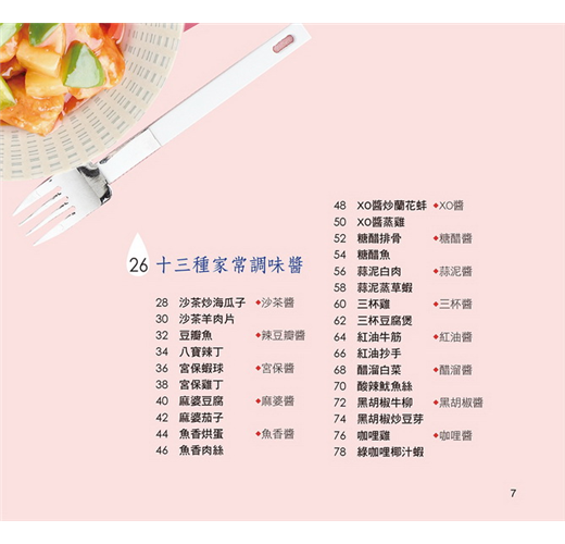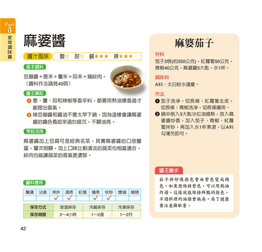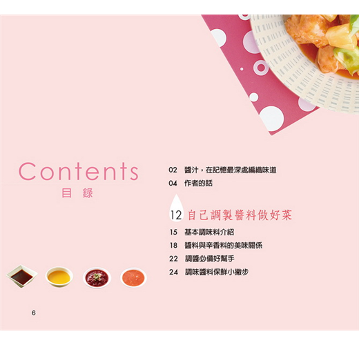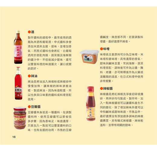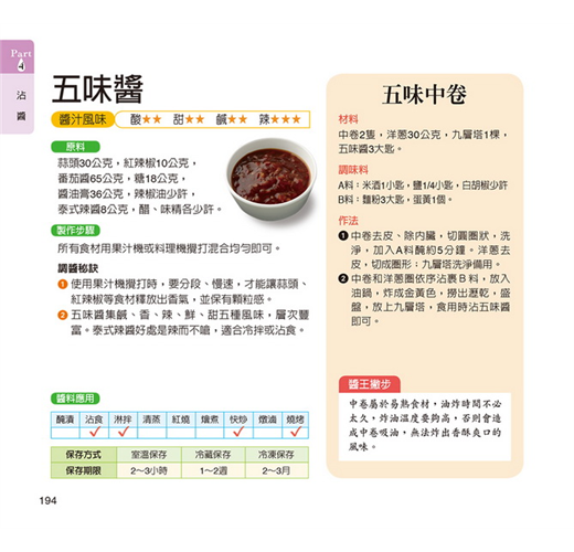 ✧琳瑯滿目的醬汁製作秘訣:選擇家庭最常用的醬料,如糖醋醬、宮保醬、xo醬、沙茶醬、辣豆瓣醬、魚香醬、蒜泥醬、麻婆醬、三杯醬、紅油醬、黑胡椒醬、咖哩醬等,介紹醬料製作秘訣和代表性食譜。