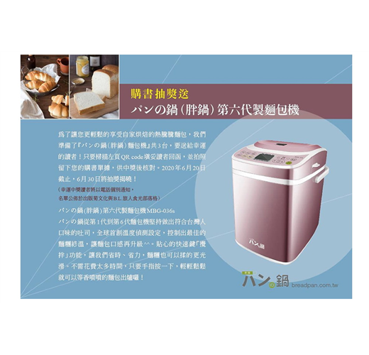 購書再抽「パンの鍋麵包機」2020年6月20日前購書就有機會抽中『パンの鍋(胖鍋)麵包機』MBG-036s共3台市價$4980,讓您更輕鬆的享受自家烘焙的熱騰騰麵包!