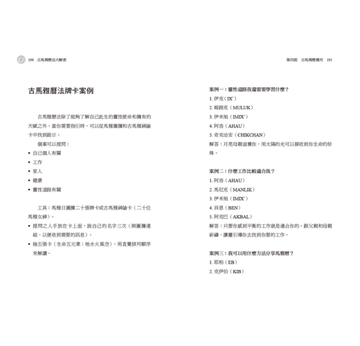 這本書整合了米格爾所提供的馬雅資料和實務教學的紀錄,再加上學員們所分享的案例而成,我期待它是一本學習古馬雅曆的工具書,藉此獻給所有對古馬雅曆有興趣的人參考使用。
