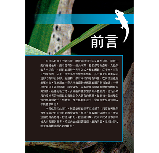 本書就是因此而生。無論是爬蟲類專家或新手,只要有興趣學習更多關於目前買得到的食蟲蜥,都是方便取用的資源手冊,所以別怕把封面捲彎、把書角折起、把書翻到爛。我本來就希望本書常被大家利用與參考。希望內容能回答疑惑、解決問題,並消除努力飼養食蟲蜥時所遇到的難題。