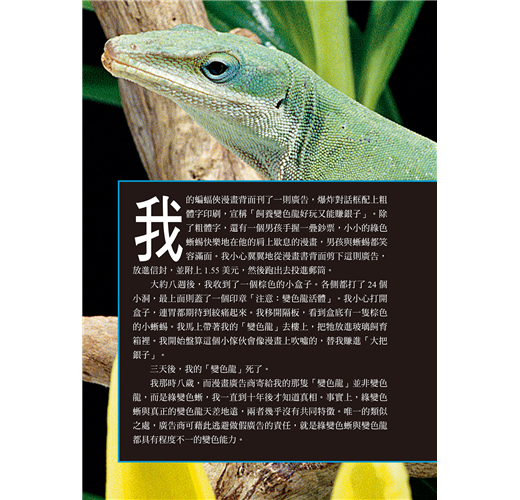 我的蝙蝠俠漫畫背面刊了一則廣告,爆炸對話框配上粗體字印刷,宣稱「飼養變色龍好玩又能賺銀子」。除了粗體字,還有一個男孩手握一疊鈔票,小小的綠色蜥蜴快樂地在他的肩上歇息的漫畫,男孩與蜥蜴都笑容滿面。我小心翼翼地從漫畫書背面剪下這則廣告,放進信封,並附上1.55 美元,然後跑出去投進郵筒。