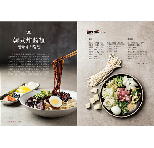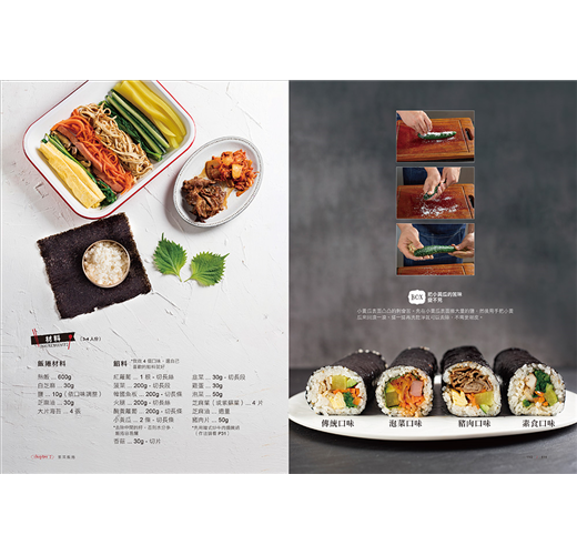 1. 集結傳統正宗的道地韓食,每一道都是韓國人從小吃到大的經典料理。一上餐桌就擺滿的水泡菜、涼拌豆芽菜、韓式炒雜菜等各式韓國小菜;每個韓國媽媽都會做的煎餅以及大醬湯;在韓國中式餐廳裡必點的炸醬麵與糖醋肉;街頭隨處可見、菜料豐富的韓式飯捲……從家常菜、餐廳名菜到街邊小吃,全書收錄53道最道地的韓式美食。