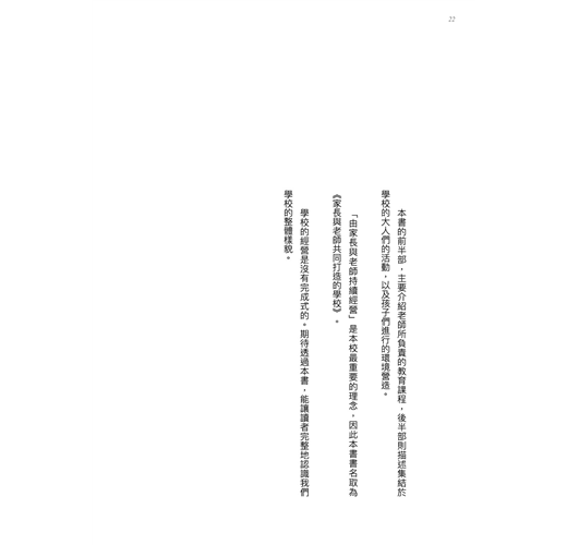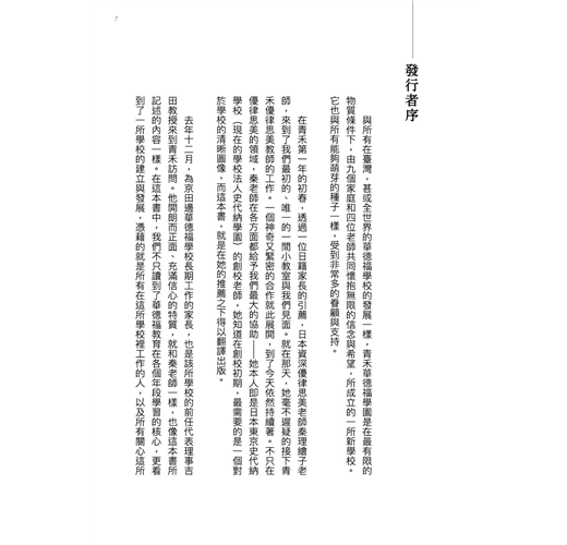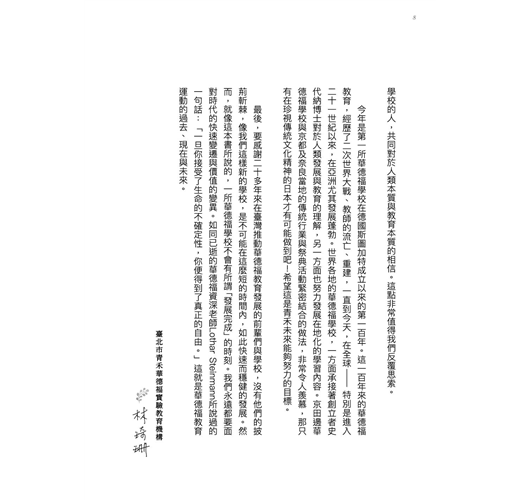 這本書不只適合對華德福教育有興趣的讀者,對於投身或關心台灣目前風起雲湧的實驗教育的工作者或家長而言,它也是相當值得借鏡與參考的文獻紀錄。本書完整記錄了一所「NPO法人學校(類似台灣的實驗教育機構)」誕生的歷程,從創校前宣傳理念、籌措資金、尋覓校地、思考校舍到建校後如何營運與組織親師共同工作,乃至畢業生的出路以及家長回顧座談會等,均有詳盡的紀錄與說明。
