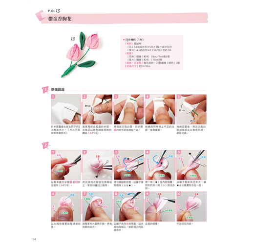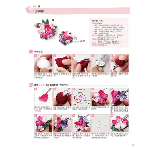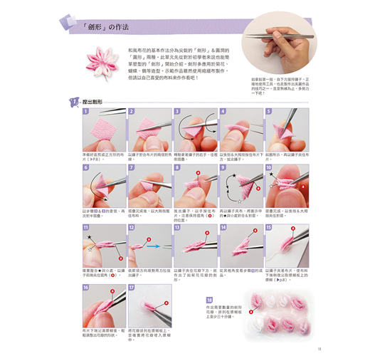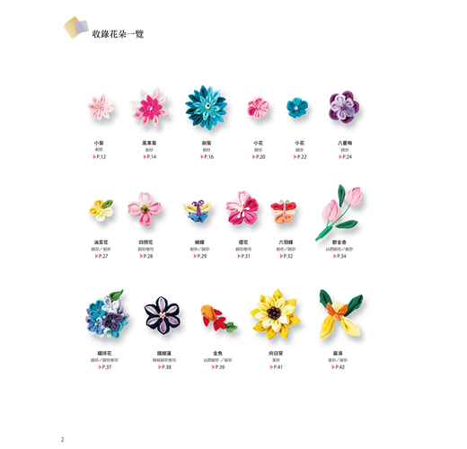 所謂和風布花是屬於日本傳統工藝的一種,它是將裁成正方形的布片摺疊後沾取漿糊貼在底座上,作出花卉&鳥兒等模樣的作品。從前的工匠所使用的是薄正絹材質的羽二重布料,但本書使用的則是比較起來容易取得、製作的正絹縮緬布與綸子&木綿布料等,實際操作時也可依自己喜好自行挑選布料製作。