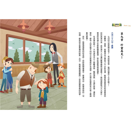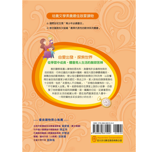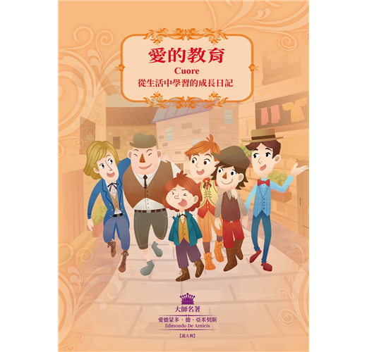 從學習中成長,體會旁人生活的酸甜苦辣 善於觀察周遭人事物的恩利科,身邊有許多值得他效仿的好朋友:行俠仗義的大塊頭卡羅納、雍容大度的學霸德羅西、挑戰自我的駝背納利、替父母分憂解勞的柴商兒子科列帝,以及懂得反省自我的富家少爺沃提尼。除此之外,家人對他的諄諄教誨也十分受用,包括「友愛他人不分階級」、「珍惜自身擁有的一切」、「不可拿家人出氣」等。老師每個月在課堂上說的小故事,亦啟發了他對國家的認同與歸屬。這一篇篇的日記,記錄著恩利科對於生活的細膩心得,現在我們邀請您走入書中,一同欣賞他多采多姿的小四生活。
