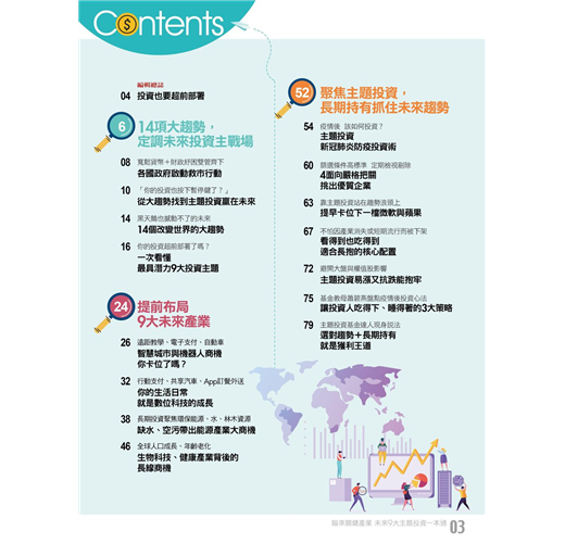 ◎投資新方向:機器人、智慧城市、數位科技、保安、水資源、環保能源、林木、生物科技、健康等,預告全新投資策略。