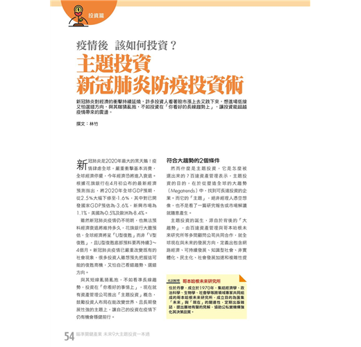全球疫情連環爆,各國股市也紛紛大跌反應,投資人每天彷彿就在看國內外最新感染人數、看美股熔斷、看歐亞股市崩盤中循環,若把投資重心放在「猜低點」,恐怕只會落得進退兩難。其實面對不可知的市場,唯有投資「未來趨勢」,才能不懼市場波動。