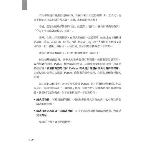 本書作者 Dan Bader (知名 Python 教學網站 『Real Python』 站長) 以清晰的範例及圖解, 直搗 Python 各種強大的內建進階功能, 透視背後運作原理, 讓你釐清觀念、避開常犯錯誤, 最終寫出簡潔又實用的『Pythonic』程式!