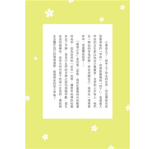 距今大約八十年前,即一九四一年初的彰化鹿港(當時稱彰化郡鹿港街),第一天上小學的小女生丁淑惠,第一節課就在學校尷尬出糗。這個令人訝異的序幕,導引出一連串以鹿港丁家為主軸的精彩的「鹿港少女」故事二部曲。由日治時代末期到臺灣光復的五年間,小惠從相信自己是「日本人」,到一夜之間變成「臺灣人」,生活內容和意識形態都發生鉅變。讀者隨著小惠經歷當時臺灣兒童的處境,也隨著小惠度過波瀾起伏的童年。