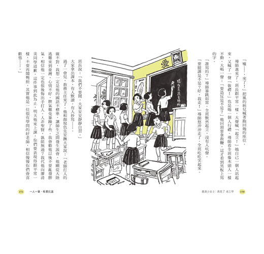 再來談談「鹿港少女」這兩本小說的共有特色,包括:時空背景的特殊性,以及對少年兒童讀者的啟發性,不但讓親情、友情、手足之情⋯⋯躍然紙上,大時代下的臺灣人的國族際遇、韌性與骨氣,更引人深思。這兩本小說的時空背景,一本是一九四一年到一九四七年,一本是一九四七年到一九五〇年。從小學到初中,從鹿港小鎮到彰化大城,從戰爭末期到百廢待興的戰後。那時候,物資缺乏,社會動盪,人心不安。國人的身分,從臺灣人、日本人,變成中國人,在家說臺語,國校讀日文,「國語」從日語變成北京話。書裡還有臺灣人和日本人,本省人和外省人的種種互動問題,形成不少的插曲和事件。舞臺的主角,也從小女孩變成頭髮像西瓜皮的少女。舞臺上的角色,有兇惡的日本警察,可敬的日本女老師,《一年櫻班 開學了》裡有「清國奴」的一巴掌事件,有家裡的鐵欄杆被拆,鐵床被搬走事件。《再見了 老三甲》有講著南腔北調讓學生聽不懂的外省老師,有飯盒裡只有白飯拌鹽的同學,有天一冷就縮著脖子搓手心的老師,有不會說國語被解聘的本省籍老師,也有校長和老師被以匪諜罪名逮捕的白色恐怖。所以,這兩本書同時也是高潮迭起、動人心弦,反映時代、生活的歷史小說,為當時的臺灣,留下很好的見證,可以帶領我們了解上個世紀四十年代的臺灣。