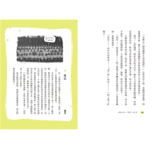只是,故事尾聲卻急轉直下。當時政治和社會局勢不安定,「白色恐怖」也波及學校,老三甲敬愛的導師和校長都遭牢獄之災。恐慌無奈又疑惑不解的老三甲們,在依依不捨當中,提前結束了初中生活,也失去期待的畢業典禮。