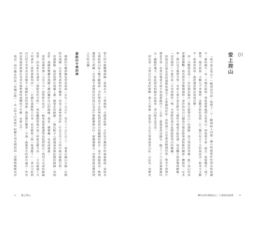 這是一本回憶錄,娓娓道來身型嬌小的三條魚是如何從一個懞懂新手,愛上登山,蛻變成縱橫國際高峰間的台灣知名登山家。從第一人稱的角度跟著她一路前行,你會看見一座座大山的身影、那些山裡的苦與樂,以及穿插其間的登山知識。透過這些故事,我們感受的不僅是山所帶來的挑戰與美,更多的是一位女性在攀登時,所面對的困難與轉折。