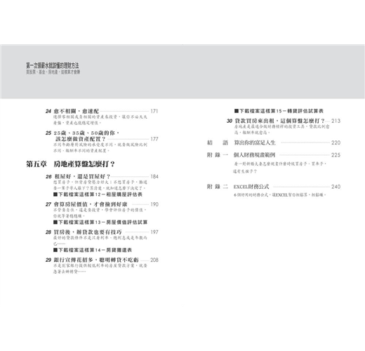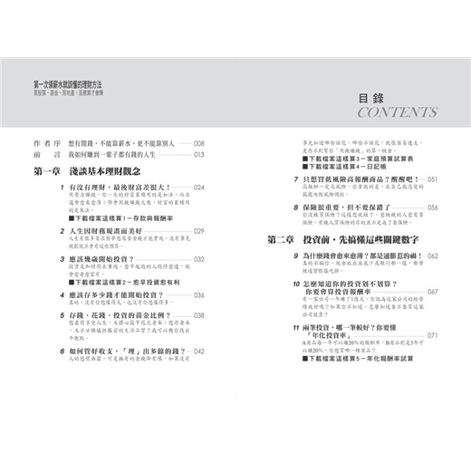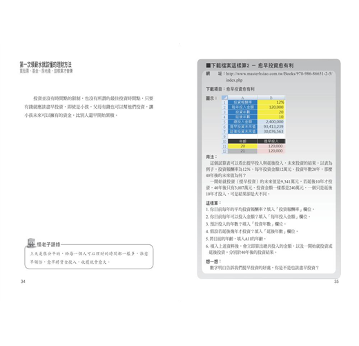 我想特別強調的是,投資的基礎財務知識非常重要,而且真的沒有那麼難理解,更不是只有財經背景的人才會懂。我深信,在茫茫的投資旅途中,唯有徹底擁有這些知識,你才可能在投資這條路上走得順遂。本書難免有一些枯燥陌生的教科書內容,我都盡我所能講得清楚簡單。有關數學的那一部分,我都已經轉換成內建公式的EXCEL試算檔案,每一個試算檔案都可以從我的個人網站上免費下載。舉凡投資理財會用到的試算表,幾乎都有,包括股票價值評估試算、房地產價值評估、生活開銷記錄等。網友告訴我,下載之後套上自己的資料就可以用,真的非常好用;有些表甚至是理專、精算師只秀給你看結果,不讓你看試算過程的珍貴表格。光是得到這些表,自己拿來應用,就受益良多。