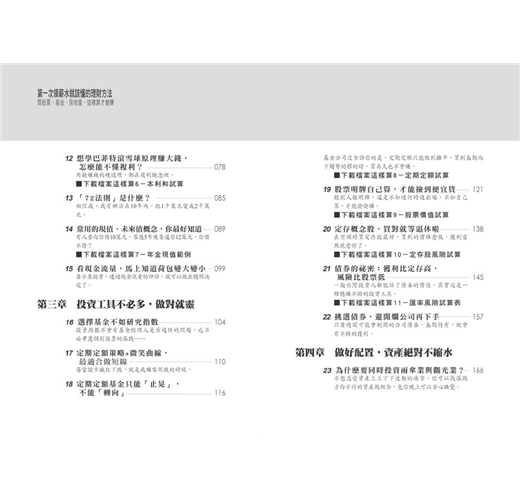 另外,如何做好資產配置及投資組合,也是本書的重點之一,這是一般的理財書較少兼顧的題材,雖然重要但卻不討喜。因為這部分若要敘述清楚,需要很多的數學,本書用了許多圖解,並以實際的範例來解說,讓讀者可以不用碰數學也可以了解當中的原理。