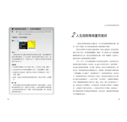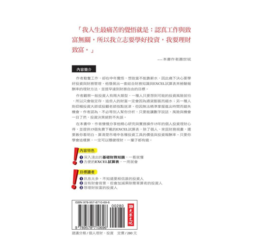 作者勤奮工作,卻在中年覺悟,想致富不能靠薪水,因此痛下決心要學好投資與財務管理,他發展出一套結合財務知識與EXCEL試算表來檢驗報酬率的理財方法,並提早達到財務自由的目標。