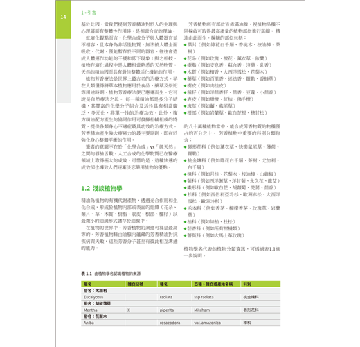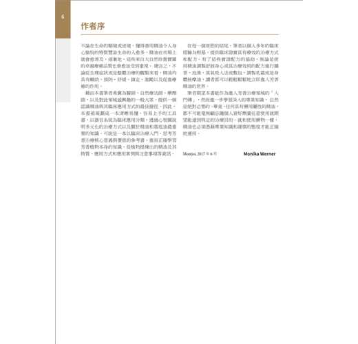 藉由本書筆者希冀為醫師、自然療法師、藥劑師,以及對此領域感興趣的一般大眾,提供一個認識精油與其臨床應用方式的最佳捷徑。因此,本書被規劃成一本清晰易懂、容易上手的工具書,以器官系統為臨床應用分類,透過心智圖說明多元化的治療方式以及關於精油和基底油最重要的知識。可說是一本以臨床治療入門,思考芳香治療核心意義與價值的參考書,進而正確學習芳香植物本身的知識、從植物提煉出的精油及其特質、應用方式和應用案例與注意事項等資訊。