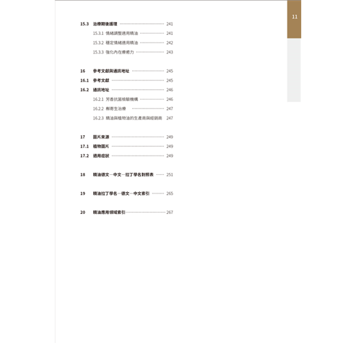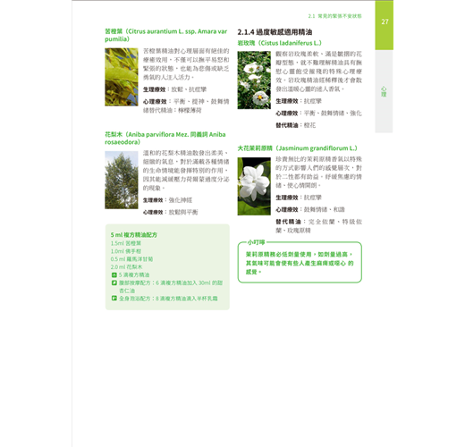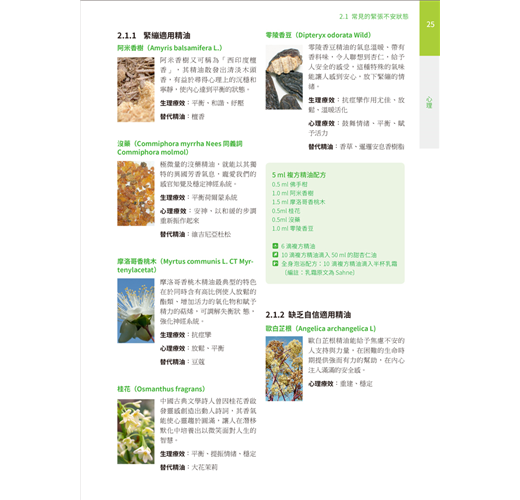 在每一個章節的結尾,筆者以個人多年的臨床經驗為根基,提供臨床證實具有療效的治療方式和配方。有了這些實證配方的協助,無論是使用精油調製舒展身心或具治療效用的配方進行擴香、泡澡、蒸氣吸入法或敷包,調製乳霜或是身體按摩油,讀者都可以輕輕鬆鬆地立即進入芳香精油的世界。