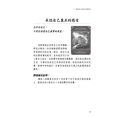 這套牌卡很適合初學者,以及不想記太複雜、需要記誦牌義的使用者。牌面的主題與說明,就像此起彼落的精靈絮語,切中當下的話語總是適時出現。此外,牌義補充說明羅列出許多明確的指引或具體方案,完全可以立即上手。
