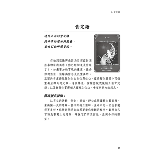 ✧指引手冊內含牌卡淨化與使用步驟,每張卡片亦傳達著溫暖的話語以及清晰的指引,幫助我們理解精靈指引卡的訊息。