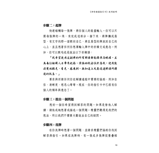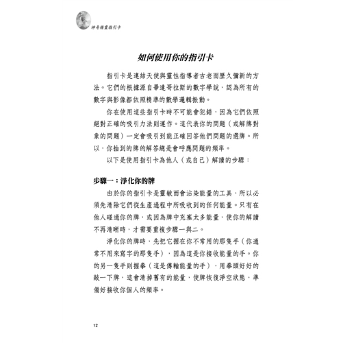由於你的指引卡是靈敏而會沾染能量的工具,所以必須先清除它們從生產過程中所吸收到的任何能量。只有在他人碰過你的牌,或因為牌中充塞太多能量,使你的解讀不再清晰時,才需要重複步驟一與二。