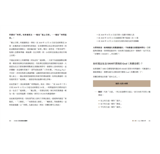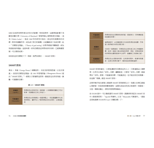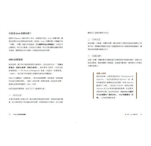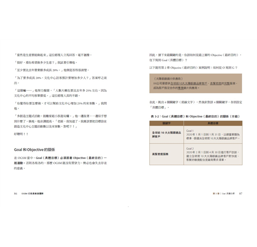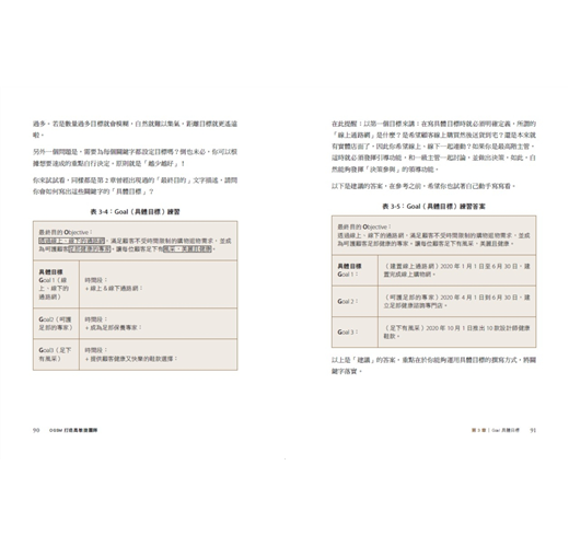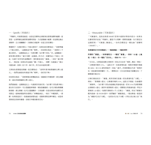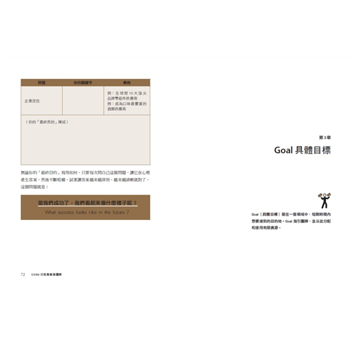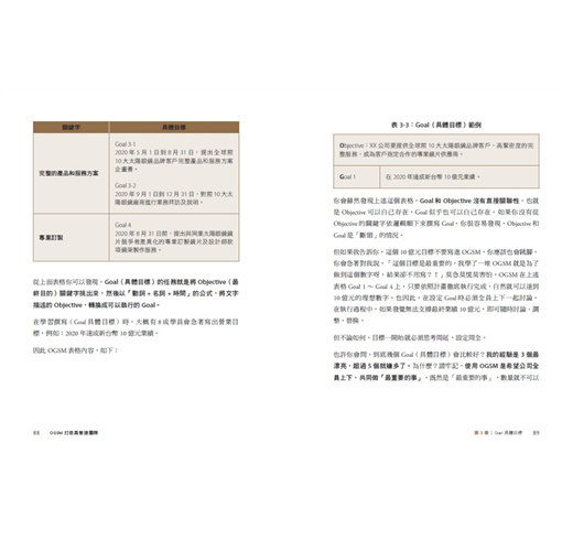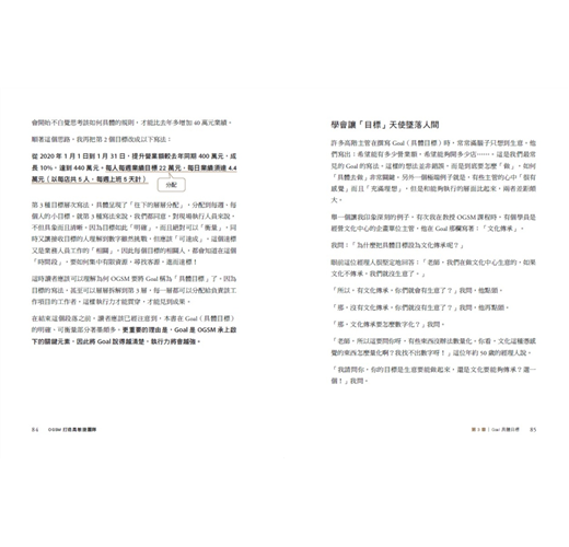 前言 OGSM簡便好用 我在外商工作超過15年。不論是2019年全球市值排行53名的法商歐萊雅集團(L'Oreal),還是美商雅詩蘭黛集團(Estee Lauder),每次週會、月會時只要透過一張計畫表,就可在內部、外部快速溝通,並進行修改。 OGSM系統是行之已久的工具,它協助我們度過許多市場難關,幫助快速進行溝通,讓公司員工覺得把事情做完最重要,但是少了相互指責。透過OGSM 這個簡單的「工具」,我在商周CEO領導學程的變革管理課程中,前後輔導超過500位總經理及CEO。我也運用OGSM工具,直接協助企業產出願景描述,討論企業定位和策略目標。 我們快速適用OGSM,在科技、生技、金融、化工、服飾、餐飲等產業,並與高階經理人共同經歷變革路程。早在出版此書的10個月前,當我第一次被問到OKR時,我驚覺到,原來大家對於「即學、可用」工具竟是如此地渴望,這讓我興起撰寫本書的念頭。 OKR帶起企業討論旋風 《OKR:做最重要的事》(Measure What Matters)在2018年4月出版之後,緊緊抓住了全世界經理人的眼球。作者約翰‧杜爾(John Doerr)以創投公司總經理身分,提出OKR核心觀念及案例說明。另一本《執行OKR,帶出強團隊》(Objectives and Key Results)也由兩位OKR專職培訓教練保羅‧尼文(Paul R. Niven)及班‧拉莫(Ben Lamorte)撰寫,提醒使用OKR的注意事項。大家著迷於OKR的目標執行,也非常興奮地發現這是一個以團隊溝通為主的執行表格,更棒的是,聽說可以不用和KPI(Key Performance Indicator,關鍵績效指標)掛勾,著實讓許多人開心不已。 但是我看完市面上所有關於OKR,包含中、英文版的相關書籍和報導之後,我的頭開始發疼。心中興起疑問──我不知道這個工具要如何使用! OKR的缺點 看完書,你當然不知道要怎麼用!因為: 一、OKR 的思路轉折交代不清 OKR沒有將重要思路轉折具體寫出來,你看完O(Objectives,目標)直接跳到KR(Key Results,關鍵結果),此種跳躍式解說,讓沒有寫過這種工具表格的你,自然覺得無法連貫。 二、OKR缺乏實做示範 雖然書中大量的概念及思維,把工具的背景和想法說得清楚,但少有連貫性的示範及解說,縱使讀者使用書中提供的工具,也難以實際練習。 三、OKR無法貫穿執行 因為OKR 只有兩層(O & KR),書中所提到的執行力,如何往下展到第三層,令人不解。因為有這樣的困惑,舉例來說,甚至某企業大老闆覺得OKR 實在很棒,不忍放手,決定公司中高層用OKR,基層還是沿用KPI。結果,中階主管不但要填OKR,還要處理員工的KPI,然後OKR 和KPI 兩者評分到底如何串聯,完全搞不清楚。所有主管處於高度焦慮的模糊狀態。光是被員工詢問,就被問傻了。這樣一來,執行OKR 反而產生企業在溝通上被攔腰斬斷的困境。 四、不知如何修改OKR 知道要寫O(目標)但是不確定KR(關鍵結果)寫得到底對不對。整個表格看起來邏輯不通暢,思路跳躍。另外,這個表格是要用Excel、Word、還是要額外買系統操作?如果買了新系統,要如何跟目前的績效考核和其他工作表串聯? 回到初衷:簡單學,學簡單的。 工具是拿來使用的,不是嗎?其實,你應該要學的是:一頁計畫表。 OGSM,這才是真正能執行的簡易工具法。 什麼是OGSM? OGSM,我又稱它為「一頁計畫表」。 OGSM根基於管理學大師彼得‧杜拉克的「目標管理(Management by Objectives,MBO)」概念,在企業願景之下,透過「目標」、「指標」將理想轉化為可以被執行的具體行為。美國太空總署(NASA)在1969 年以「目標管理」方法,進行專業分工,完成人類首度登陸月球的巨大計畫,算是「目標管理」首樁被完美執行的大型專案。 但其實早在1950年代,為了達到精實生產,由日本豐田汽車(TOYOTA)製造商所設計及執行的工作計畫表,就是OGSM最早的雛型。OGSM的出現,用意是要連結在汽車生產的流程中,各單位不一的工作速度,因此,OGSM以零庫存為目標,現場主義為支撐,逐漸形成工作表。 只要一張工作表就能讓各單位理解,並且馬上反應。OGSM工作表的精神就是力求簡單、一目瞭然,用大腦、用雙手、用隨手可取的方式,讓彼此溝通,不需要依靠複雜的電腦及系統。因為簡單,所以人人可用。 OGSM 後來被快速消費品產業龍頭寶僑(P&G)公司所採用,成為內部執行的重要工作表格。透過一頁的精簡訊息,可以快速修正策略,反應市場,集團下300多個品牌,14萬名員工,在清晰的企業願景下,讓各品牌事業部在每週、每月、每季的溝通和會議上,各自獨立運作,期望能藉此快速回應消費者要求,應對市場變化。 不同於汽車產業,寶僑的通路都在零售業的大賣場,產品缺貨、貨品滯銷,將會很迅速地反應在財務報表上。寶僑藉由OGSM 表格,讓經理人只需要投注2成到3成的專注力,即可獲得通路產業所需要的敏捷力,甚至可以主導消費者喜好和需求,輕鬆應戰市場。 除了日本豐田汽車、美商寶僑之外,OGSM 也是美國可口可樂(Coca-Cola)、德國福斯汽車(Volkswagen)、法國歐萊雅、法國希思黎(SISLEY)、荷蘭海尼根(Heineken)等跨國企業的策略行動計畫表。 經過半個世紀,OGSM 被各種產業、各種規模的企業運用和考驗,可惜一直未有人完整理出脈絡,一直到2014年兩位曾任職於寶僑公司,後來創辦荷蘭商業開創家(Business Opener)顧問公司的馬克‧ 馮‧ 艾克(Marc van Eck)及艾倫‧林豪茲(Ellen Leenhouts)以《好企劃一頁剛剛好》(The One Page Business Strategy)一書,將OGSM的執行及做法集結成冊,這項深藏在企業的執行力神器終於問市。此書在美國亞馬遜網站獲得5顆星評價,並被美國聯合利華(Unil