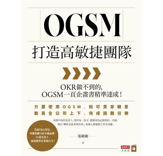 透過OGSM精進團隊執行力 文│李 仁 芳 討論「競爭策略」的管理書籍很多,説是用來啓發高階經理人。但是對身負承上啟下(Middle-Up-Down)職責;擔任組織中流砥柱任務的直線主管(Middle Line)與功能支援幕僚等經理人而言,卻少見如《OGSM打造高敏捷團隊》這種討論「團隊執行力」,並能帶給經理人深具豐富的實戰案例,處處展現作者實戰管理智慧與洞見的教戰手冊。 管理大師彼得‧杜拉克(Peter Drucker)曾說:「管理可以學習,但很難教導。」意思是經理人的自我啟發是非常重要的。尤其「高敏捷團隊」的打造又不像「行銷」、「財務」等具體性功能領域,本身的原則與觀念比較抽象。 但是,沒有「團隊執行力」,哪來的「策略競爭力」!所謂「Strategizing is NOTHING. Organizing is EVERYTHING!」 層層相扣的OGSM 跟「計畫95%、執行5%」相比,「計畫5%、執行95%」的組織才是真正強韌度高的組織。OGSM的運轉具備組織上下層團隊執行力的貫徹能量:上層的Strategy策略是下層的Objective最終目的(兩者皆為質性的描繪);上層的M-Dashboard衡量指標是下層的具體目標Goal(兩者皆為定量的呈現)。上下數個層級的OGSM階梯圖,就把全公司各執行團隊的「目標網絡」和「全員執行力」貫穿徹底。 只要能夠每次執行比上一次進步,公司和個人都會成長。經過數回合的持續推動發酵(作者以親身顧問經驗分享指出,短短8個月循環就會產生驚人效果)。下一循環會比這次循環還要更好,公司與個人又會再進一步成長。就這樣,藉由組織縱線垂直貫穿的OGSM階梯,一層層確保企業上下全員績效上升,公司與個人將可以獲得永續性成長。 OGSM有效提升經理人生產力 過往全球化的世界局勢正在進行驚天動地的質變,世界工廠的供應鏈斷鏈,歐美日市場的需求鏈停擺。現在,全球包括台灣的產業和經理人,都身處換局重來的新挑戰。無論是剛進入職場的年輕人,或是正在人生中場的中年中階幹部,就業與職場的挑戰性可能是10年前的5倍以上,甚至不止。我個人觀察身邊的EMBA朋友們的職場動態,現階段的狀況可説是極具挑戰性。 其實我們每個人都不是任何「老闆」的員工,我們每個人都是自己「生涯」的員工。沒人欠我們一個飯碗,你必須自己當家。認清只有你自己(不是你的「老闆」)才是自己的主人。為了打贏愈來愈激烈的「保職戰」,我們得好好提升自己的「產出價值」,增加自己的附加價值與生產力,不能須臾懈怠。一天24小時我們都該竭盡心力求好、求進步。 經理人的「時間」是最稀缺的戰略資源。尤其對經理人而言,承上啟下,事情永遠做不完。經理人永遠有忙不完的事——永遠有更多事情要做,永遠有更多事情應該做,也永遠超過你所能負荷。也因為這項工作特性,經理人必須有同時處理數件管理活動的能耐。另外,他還得知道何時該移轉活動,把精力擺在最能促進整個團隊生產力的活動上。 一個經理人的生產力,就等於它直接管轄和間接影響力所及的團隊生產力加總: 經理人的產出=團隊產出加總= a × O+ b × G+c × S+d x M +……。 (a、b、c……:代表管理槓桿率,O、G、S、M⋯⋯:代表各項管理活動。) 基於此概念,經理人即得以憑此檢討提升本身的生產力,具體的方法就是: ——加速每一項管理活動執行的速度; ——提升每一項管理活動的槓桿率; ——調整管理活動組合,剔除低槓桿率活動,代之以高槓桿率的活動! 經理人的使命就是不斷精進。其中,上述第3項「選擇與放棄」尤其關鍵。為團隊導入OGSM無疑是經理人對團隊生産力貢獻槓桿率最高的管理活動。 本書作者本身曾任職歐萊雅集團(L'Oréal)蘭蔻(LANCÔME) 、美商雅詩蘭黛集團(Estée Lauder)、海洋拉娜(LA MER)、資生堂(SHISEIDO)……等歐美日系一流品牌總經理、教育訓練經理、台北101大樓旗艦店店長等線上職務,有著深厚的「高敏捷團隊」打造實戰經驗。又曾輔導豐田汽車(TOYOTA)、奧迪汽車(Audi)、索尼(SONY)、ZARA、新光三越、大聯大、雅虎奇摩(YAHOO!)……等名門企業實務推動管理及溝通。 她不只是「用腦思考」的言教者而已,更是手把手,實事求是,劍及履及,懂得「用手思考」的One on One個人近身教練。書中討論「團隊専注」、「團結」、「集氣」、「以價值領導團隊,以邏輯執行細節」……等攸關如何成為一個好主管,一個思路清晰,喜歡並且擅於團隊溝通的好主管的實戰戰鬥技巧。 作者身具10年以上在各大世界級企業中操作300多組OGSM案例的手感經驗,可謂成竹在胸,《OGSM打造高敏捷團隊》娓娓道來,都是具體案例的解悟與概念推導的解悟交錯並行。對讀者而言,真的可以實學實行,在自家團隊中行易操作。並且真正做到「思考如行動者」,也真正做到「行動如思考者」——鍛練自己成為真正能知行合一,自強不息的強者! (本文作者為國立政治大學商學院退休教授)推薦序2 OGSM,一輩子實用的管理技巧 文│何春盛 認識張敏敏老師是在商周CEO學院課堂上,當時我應邀擔任該班的總導師,參與評審團隊個案競賽,而擔任該堂課的教練正是張敏敏女士。我看到全班六十餘位學員正在進行個案演練簡報,並接受其他組的挑戰與答辯,全班學員就像著魔一般進行激烈的論戰。張敏敏教練則是全場不停地穿梭,在適當的時間點火、引導學員發言,並且游刃有餘地擺平學員之間的辯論與衝突,那時他們演練的正是──OGSM。 當下,我就對張敏敏教練的教學風格,以及學員對她的熱愛留下深