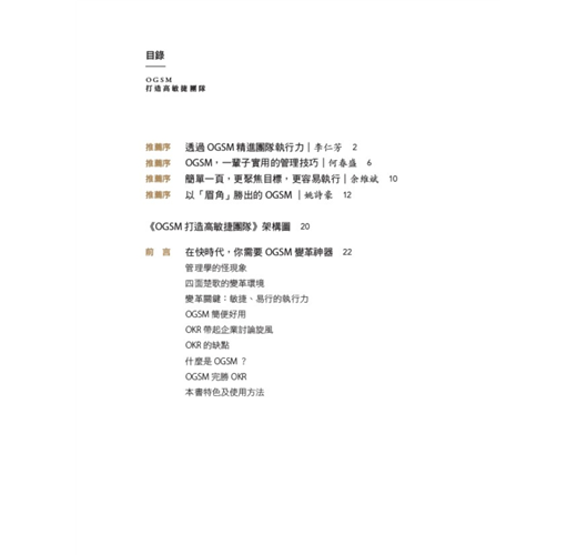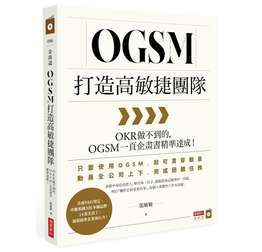 透過OGSM精進團隊執行力 文│李 仁 芳 討論「競爭策略」的管理書籍很多,説是用來啓發高階經理人。但是對身負承上啟下(Middle-Up-Down)職責;擔任組織中流砥柱任務的直線主管(Middle Line)與功能支援幕僚等經理人而言,卻少見如《OGSM打造高敏捷團隊》這種討論「團隊執行力」,並能帶給經理人深具豐富的實戰案例,處處展現作者實戰管理智慧與洞見的教戰手冊。 管理大師彼得‧杜拉克(Peter Drucker)曾說:「管理可以學習,但很難教導。」意思是經理人的自我啟發是非常重要的。尤其「高敏捷團隊」的打造又不像「行銷」、「財務」等...