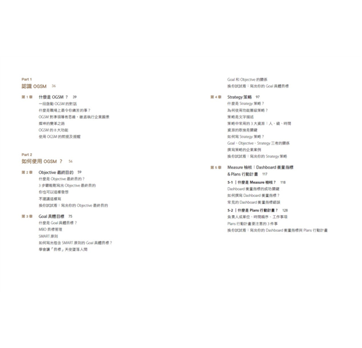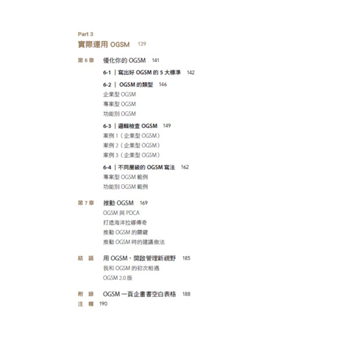 推薦序1 透過OGSM精進團隊執行力 李仁芳 推薦序2 OGSM,一輩子實用的管理技巧 何春盛 推薦序3 簡單一頁,更聚焦目標,更容易執行! 余維斌 推薦序4 以「眉角」勝出的OGSM 姚詩豪 前言 Part 1 認識OGSM 第1章 什麼是OGSM? Part 2: 如何使用OGSM? 第2章Objective最終目的 第3章 Goal 具體目標 第4章 Strategy 策略 第5章 Measure 檢核:Dashboard 衡量指標 &Plans 行動計畫 5-1什麼是Measure衡量指標? 5-2什麼是Plans行動計畫? Part 3 實際運用OGSM 第6章 優化你的OGSM 6-1寫出好OGSM的5大標準 6-2 OGSM的類型 6-3邏輯檢查OGSM 6-4 不同層級的OGSM寫法 第7章 推動OGSM 結語 用OGSM,開啟管理新視野 附錄 注釋