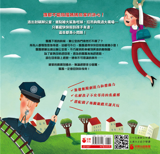 書中利用天馬行空的想像力,讓媽媽下班的回家之路充滿重重驚奇與難關,但媽媽從不放棄,依舊堅定的跑啊跑、游呀游,不管這條路有多遠、多難,媽媽都想盡快趕回家中與孩子相聚。透過有趣的故事來安撫孩子焦急等待的心情,讓每一次等候父母的時刻,變成一次新的冒險故事,感受父母堅定的愛,並知道他們一定會排除萬難回到家裡。