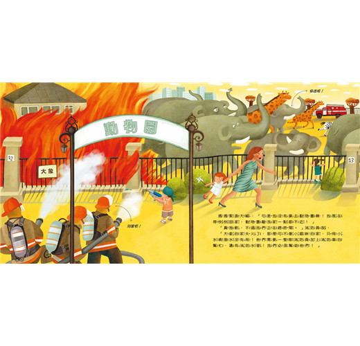 媽媽想辦法逃出辦公室後、不巧被消防車載到更遠的動物園,