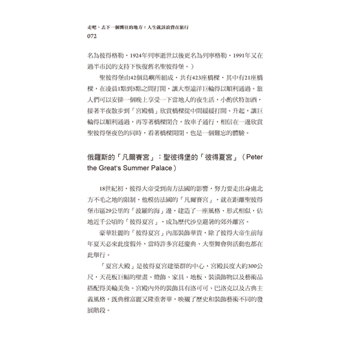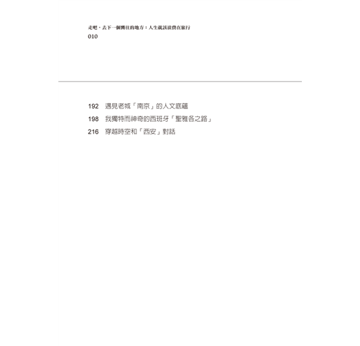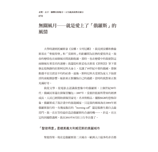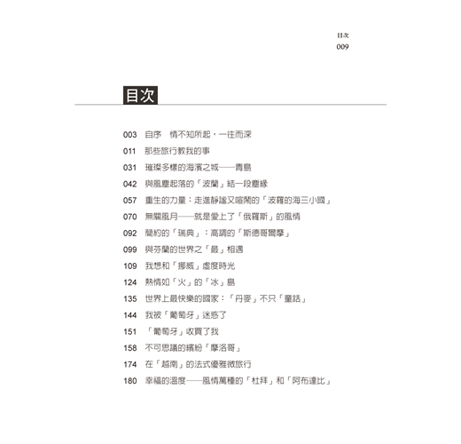 本書18篇旅遊散文,除了描繪出她眼中的景致,也記錄了旅程中的人情傳遞與交流,旅行更是人生最有意義的投資,旅途中的見聞都是獨一無二且難能可貴的經驗與收穫。