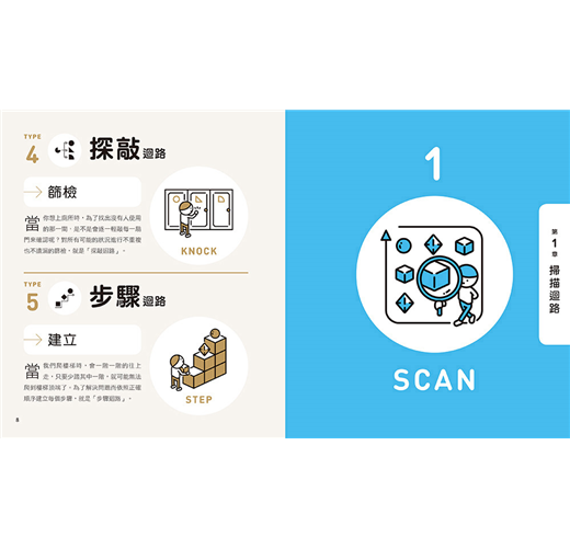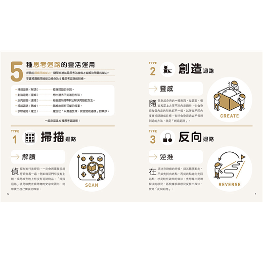 書中分為掃描、創造、反向、探敲和步驟等5種思考迴路,正是邏輯思考和解決問題的五大面向,一道又一道關卡引領我們得到從多面向看待問題的能力。