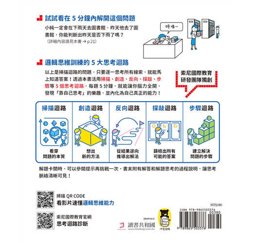 本書採用索尼國際教育團隊透過舉辦的「世界數學趣味挑戰賽」研發出「掃描」、「創造」、「反向」、「探敲」和「步驟」等5種思考迴路,成為有效鍛鍊邏輯思維能力的好方法。