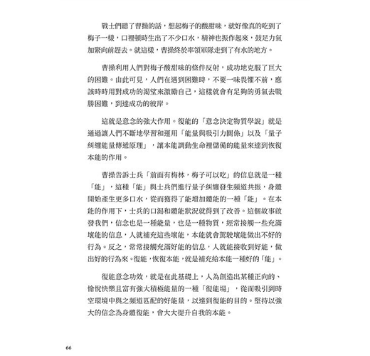而書中收集的今人復能故事,講的是能量消失了的人們恢復能量的故事,他們的故事是與我們每一個平凡人的生命都發生著關聯的復能革命,他們的故事簡單、瑣碎、樸實,是可觸摸到的脈搏,是可被感受到的真實。復能,不僅是給我們的身體復能,更是給我們消失能量的心理、靈魂、精神復能;不僅是給個體復能,還是給社會復能;不僅是給思想觀念復能,也是給文化根基復能;不僅是給現在復能,亦是給未來復能;不僅是給人類復能,更是給自然萬物、浩渺宇宙復能。自復能起,在我們的時代,消失的能量將不再消失,恢復的能量都將恢復。相信復能,就會被覆能。