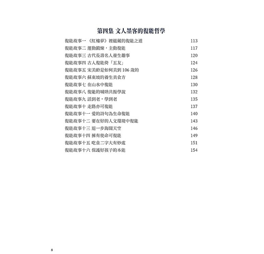 《復能故事集》分為古人復能與今人復能兩部分。書中收集的古人復能故事,深入淺出,有趣生動,豐富實用,以古人的一系列小故事為藥引子,解決的是今人已陷入各類健康誤區而不自知的大問題。讀者可由此追根溯源,明白復能是一種文化,而且是悠久深遠的歷史文化,我們必須學會用文化復能的良方。