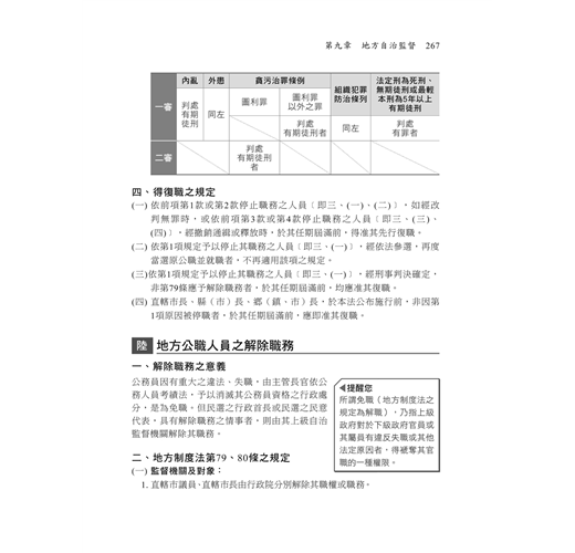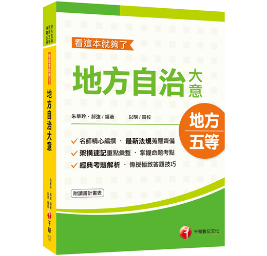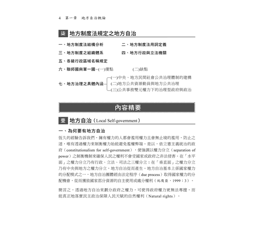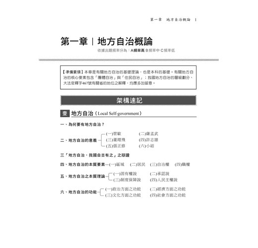 地方自治大意從命題大綱觀之,可分為法律及行政兩部分。法律的部分因命題之方式,對於多數考生而言,是較容易準備的,惟行政領域範圍又多又廣,讓人不知從何準備而起,加上坊間教科書汗牛充棟,也不知道該從何處下手購買,到底哪一本書和國家考試的內容較為契合。若是要進行重點複習,選擇本書絕對是各位考生的最佳選擇,因為坊間大多數速讀的參考書,只列出標題而已,對考生助益不大。本書除了將常考的重要的標題列出外,也將常考的、易錯的、觀念容易混淆的內文都附加上去,就如同有了骨架之後,也需要有肉,這樣才會完整。