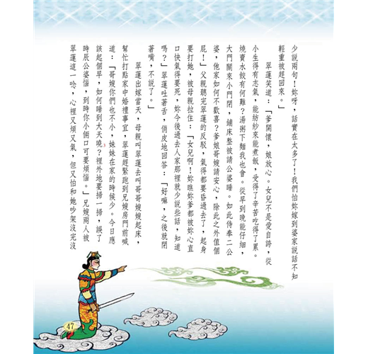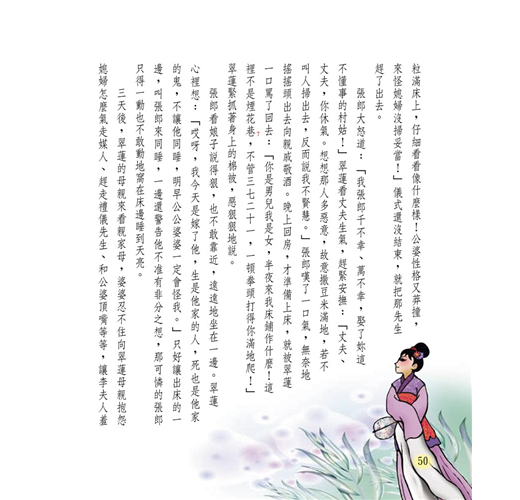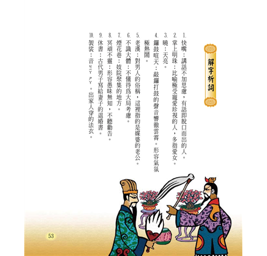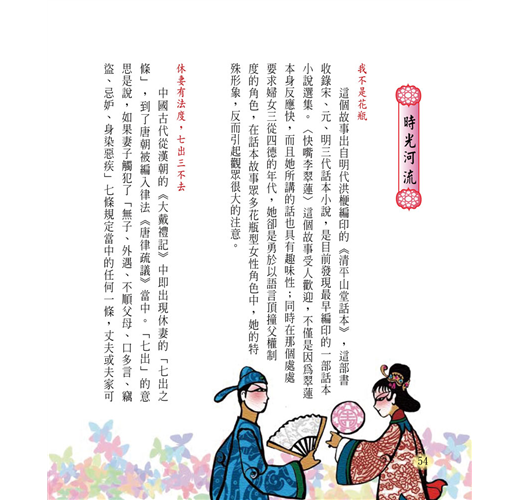 共收錄20篇宋明話本故事,包括:滿山遍野都是鬼──西山一窟鬼、言多必失── 快嘴李翠蓮、鐵面無私辨忠奸 ──三現身包龍圖斷冤、溫柔換真情──賣油郎獨佔花魁、忘恩終有報──金玉奴棒打薄情郎、神偷的惡作劇 ──宋四公大鬧禁魂張等等膾炙人口、廣受歡迎的民間故事。除了精彩故事外,亦有「解字析詞」、「時光河流」單元,針對充生難字詞作說明、補充趣味文明史話,擴大文史學視野和提升閱讀理解素養能力。