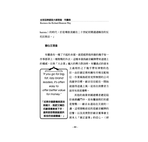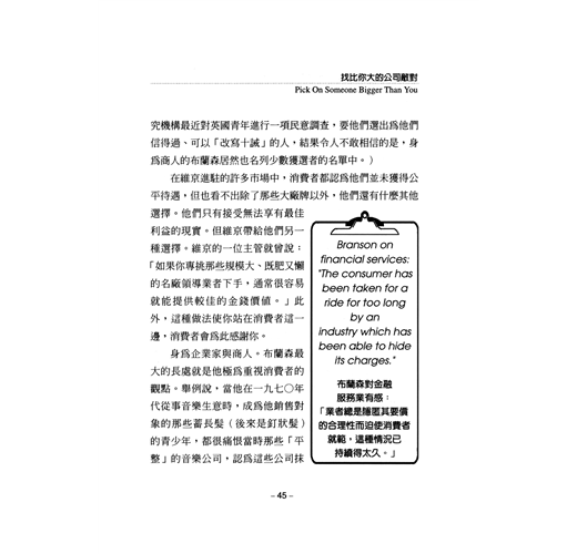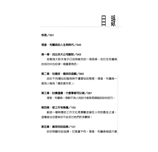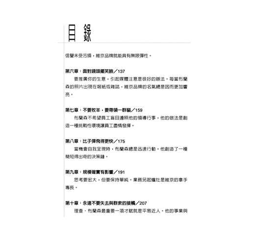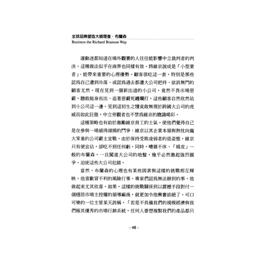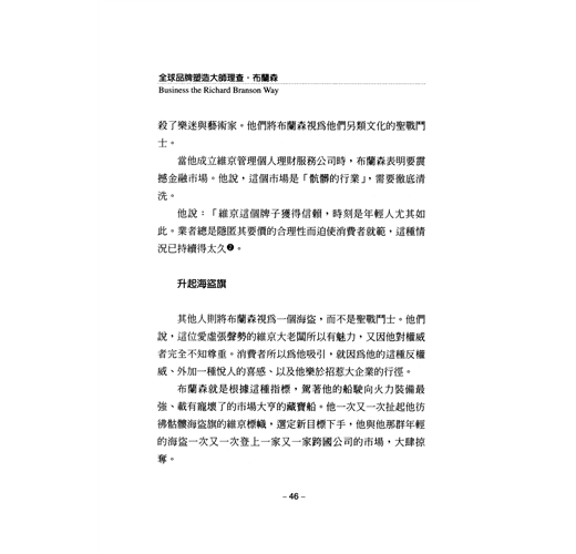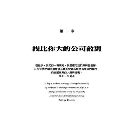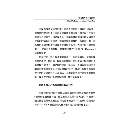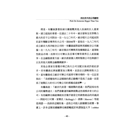 布蘭森就是根據這種指標,駕著他的船駛向火力裝備最強、載有寵壞了的市場大亨的藏寶船。他一次又一次扯起他彷彿骷髏海盜旗的維京標幟,選定新目標下手,他與他那群年輕的海盜一次又一次登上一家又一家跨國公司的市場,大肆掠奪。