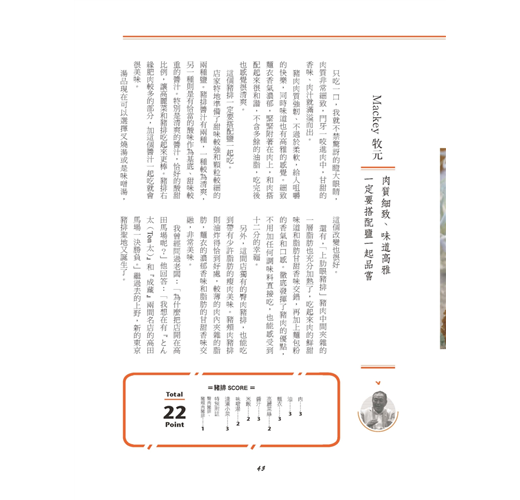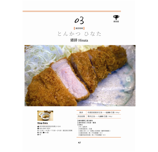 接下來,就是在他們的臉書頁面上定期看到一篇篇豬排文字的發表,連照片都有其格式:第三片豬排要轉過來拍側面(可以看出豬排的油脂和麵衣厚度),而且不只對豬排評論從嚴,連米飯到配菜都有評分,認真度不下於他們評論懷石料理或是米其林級的法菜。