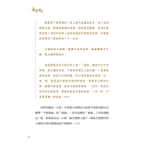 說這個現在很多修行的人哪!「瑜伽」翻成中文叫作相應。真正講修行的,不單單是嘴巴上面空講,一定要跟教的道理,你跟它行持相應。所以通常瑜伽分成境、行、理、果,就是說什麼境界我們所對的,那麼你怎麼去行持,根據什麼道理,產生什麼結果等等,一定的。等到你修行到什麼程度,那麼你就有什麼的結果,一步一步,不是單單講一個空話。