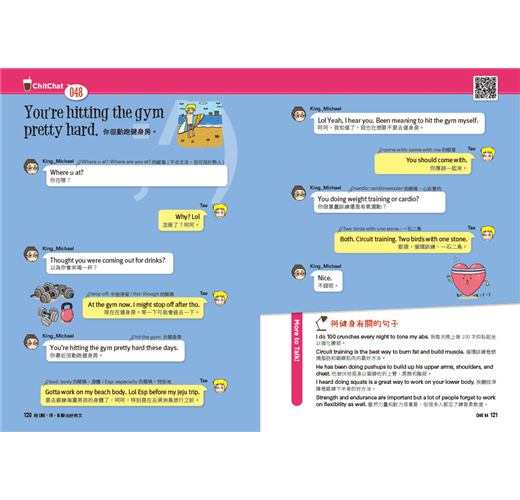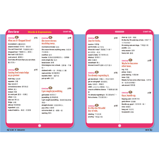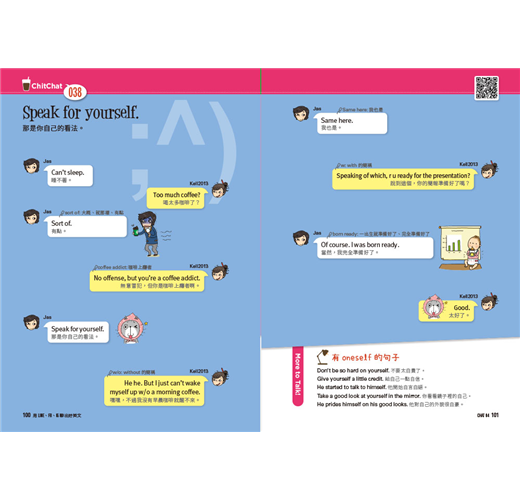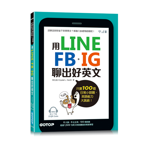 ‧提供人際關係、美食、健康、愛、外在、工作與職業、休閒活動等8大類、100個日常生活小話題,超過1,500個表達句,涵蓋和朋友、家人、同事與戀人之間的生活英語、流行英文與縮寫用法,以及有趣對話和各種聊天八卦。