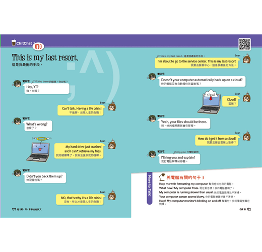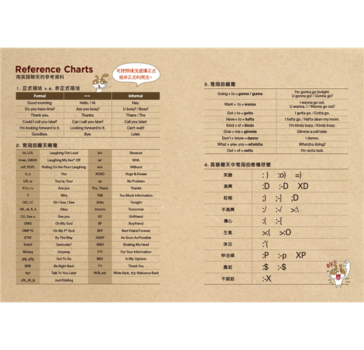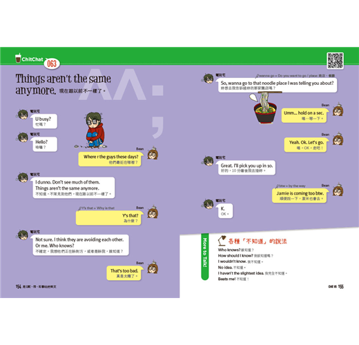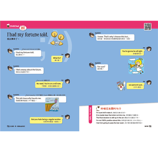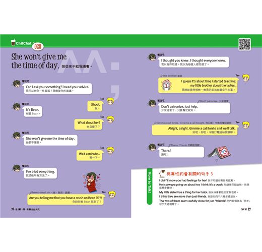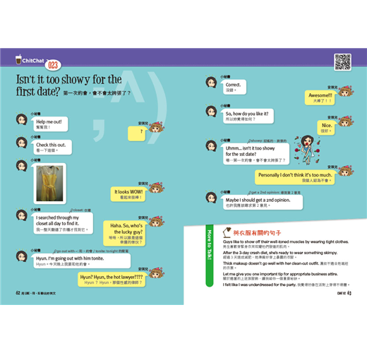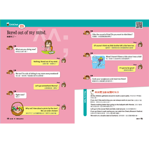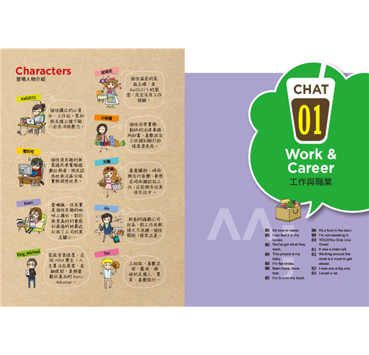 ‧這樣學英文就不會太boring,藉由9位主角的訊息對話畫面讓英文表達更具臨場感,按照每位出場人物設定會話情景,可以更快了解內容。對話中也加入貼圖、表情符號,就如同真實對話般的活潑有趣。
