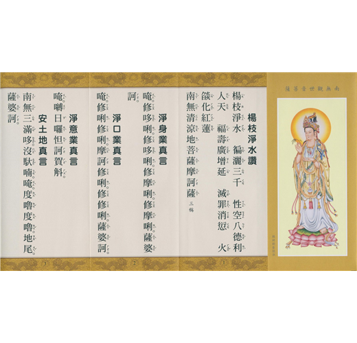《普世音菩薩門品》:無盡意菩薩請問觀世音菩薩的神通因緣,佛為說14種無畏,32種應化身等種種功德。普門品有「顯密圓通」,顯也圓通,密也圓通,顯密都得到圓通,所以普門品的功德是不可思議的。所謂:「逢凶化吉,遇難呈祥。」