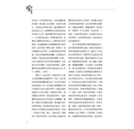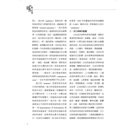 每個人生活在世界上,都像是社會生命體的肢體,或是社會網絡的節點。任何肢體受到傷害,其他的肢體也一起受苦;任何節點有所缺失,整個網絡也受到動搖。公共衛生基於社會正義與人道關懷,透過有組織的政府與民間力量,積極從事於促進健康、預防疾病、適切診療、身心復健、延長壽命、提升生活品質。流行病學是公共衛生的基礎科學,它藉著嚴謹的觀察或實驗,以及縝密的因果邏輯推理,來描述社區的疾病型態,比較人群的疾病差異,研究疾病的自然史,探討疾病的危險因子,推論致病的作用機轉,發展疾病的防治措...
