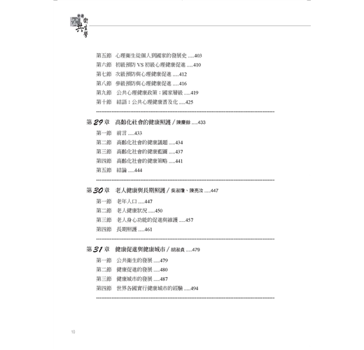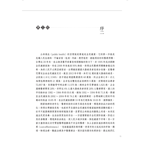 本書匯集了國內公衛學界各領域資深學者與研究者畢生思考上述問題的結晶,提供醫藥、護理、職治、物治、健康管理及公衛學界作為教科書使用;更希冀能成為所有關懷全民健康者,以及21世紀健康產業投資經營者一本重要的參考書。