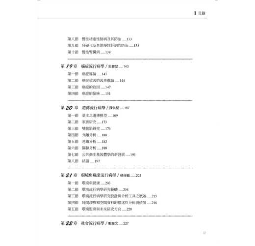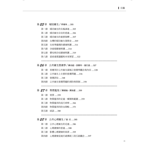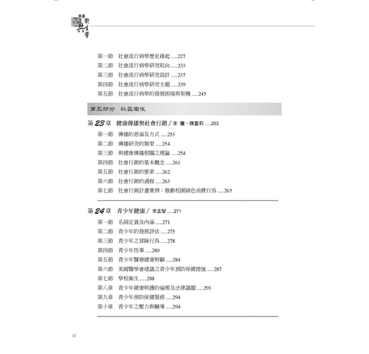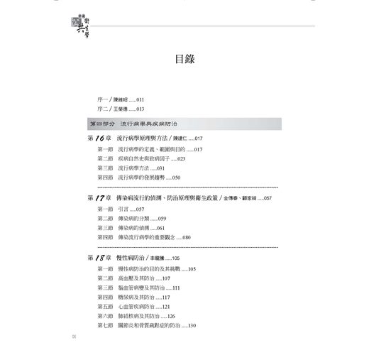 中冊分流行病學與疾病防治、社區衛生兩大部分,共16章,包含流行病學原理與方法、傳染病流行的偵測與防治原理、慢性病防治、癌症流行病學、遺傳流行病學、社會流行病學、青少年健康、婦幼衛生、公共衛生營養學、公共心理衛生、老人健康與長期照護……等方面專業內容。