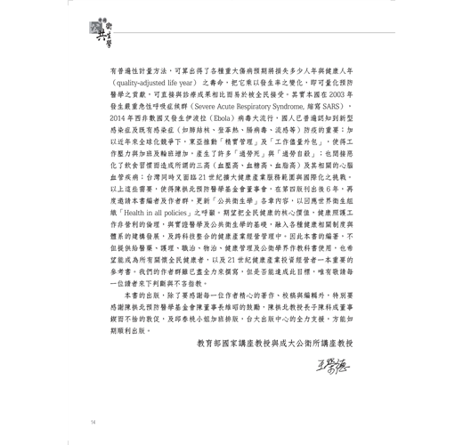 進入21 世紀,當人民經濟上已不愁日常的吃穿,就更加重視健康與生活品質。逐漸發現政府在各方面的政策均會影響到人民的健康:近年來地球暖化、日本福島核能電廠因海嘯爆炸、台灣人民幾乎都吃到摻加工業油與回收地溝油的食用油、高雄市多條街道發生油氣輸送管線爆炸、含石綿的建材與隔熱絕緣製品繼續由中國輸入台灣、伊波拉(Ebola)病毒肆虐西非也造成歐美國際傳染之威脅等等;各種層出不窮的危害人民健康事件,使得我們不得不反思應該在政府制定所有政策時,就要考慮到它對全民健康的可能影響。正如世界衛生組織在2014 年也宣示了一個重要文件――「國家所有政策內均要考慮到健康」(Health in all policies),其中格外強調國家在進行經濟與社會發展的所有政策制定與執行時,應以不危害到全民健康為先決條件。因此所有的醫藥衛生從業者與官員,均應探求政府每一項政策的健康蘊涵;主動整合不同部會與非政府組織,促進全民的健康與消除健康不平等;並聯合各國政府之相關部會密切合作,以阻隔跨國傳染、毒物運輸與環境惡化。這個趨勢其實也是全世界在此新世紀公共衛生之重大發展。因此本會重新邀請本國公衛界領導者,參考最新知識與本國實證研究來小幅改寫全書;感謝本書作者群的熱烈響應,共約有八成的章數進行改寫以加入新內容。同時也增加「公共衛生倫理」與「高齡化社會的健康照護」兩章全新的內容,呼應現代公民凡事講求倫理的作法,與思考台灣人口急速老化之健康對策。
