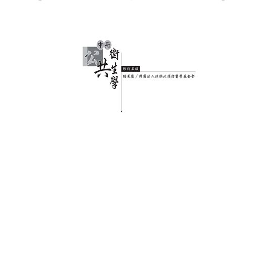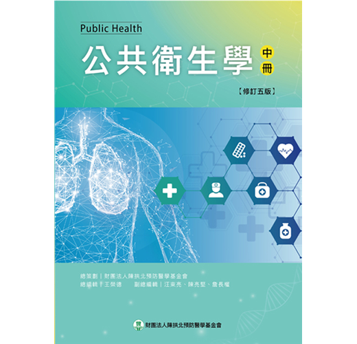 故陳拱北教授是本國公共衛生的重要奠基者之一,於1978 年逝世後,親友與學生們為紀念他效法耶穌基督捨己為人全力推展公共衛生的精神,籌款成立陳拱北預防醫學基金會繼續造福台灣人民,特別致力於出版公衛教科書,並不惜成本不定期予以更新。當本書經修訂即將重新出版之際,特藉此贅言幾句以為序。